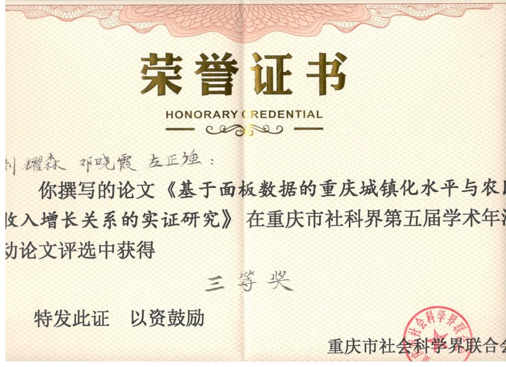 据悉,公司农业硕士生导师刘耀森教授、邓晓霞教授、左正强教授提交的论文《基于面板数据的重庆城镇化水平与农民收入增长关系的实证研究》获重庆市社科界第五届学术年会活动论文评选中获得三等奖。