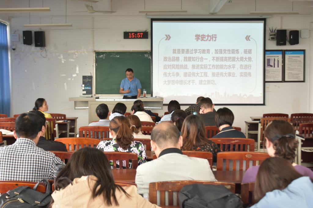 韩处长首先就习近平总书记在党史学习教育动员大会上发表的重要讲话展开宣讲报告,他指出开展党史教育意义重大,全体教师必须自始而终贯彻“四个要求”:学史明理、学史增信、学史崇德、学史力行,以达到学党史悟思想,办实事开新局的目的。随后韩处长从四个方面详细的将相关会议精神传递给全体教师,其中包括:重庆市革命传统的重要论述,党百年来主要的领导思想,党的艰辛奋斗等重要内容。他号召教师们要切实増强“四个意识”、坚定“四个自信”、做到“两个维护”。与会的老师们,仔细地聆听韩处长的宣讲报告,认真地记录着所讲的内容,深刻领悟会议所传达的重要精神理念。