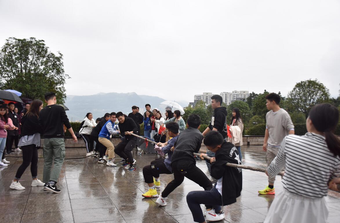 尽管活动现场细雨纷纷,但同学们的热情丝毫没有因此而减退。因为正是这样的天气才让大家对于中华人民共和国从无到有,历经沧桑与考验,不断成长、茁壮的过程更加地感同身受。悠扬的国歌声中夹杂着淅沥的秋雨,活动渐渐拉开帷幕。参与活动的员工一共有16个组,在每个组设计好自己的队名和口号后,活动转场到了莲花广场。通过爱国知识竞答、吹红墨画游戏、多米诺骨牌比拼、挤压红气球比拼以及拔河比赛等比拼来激发当代老员工的爱国热情与青春活力,营造团结积极的公司氛围。
