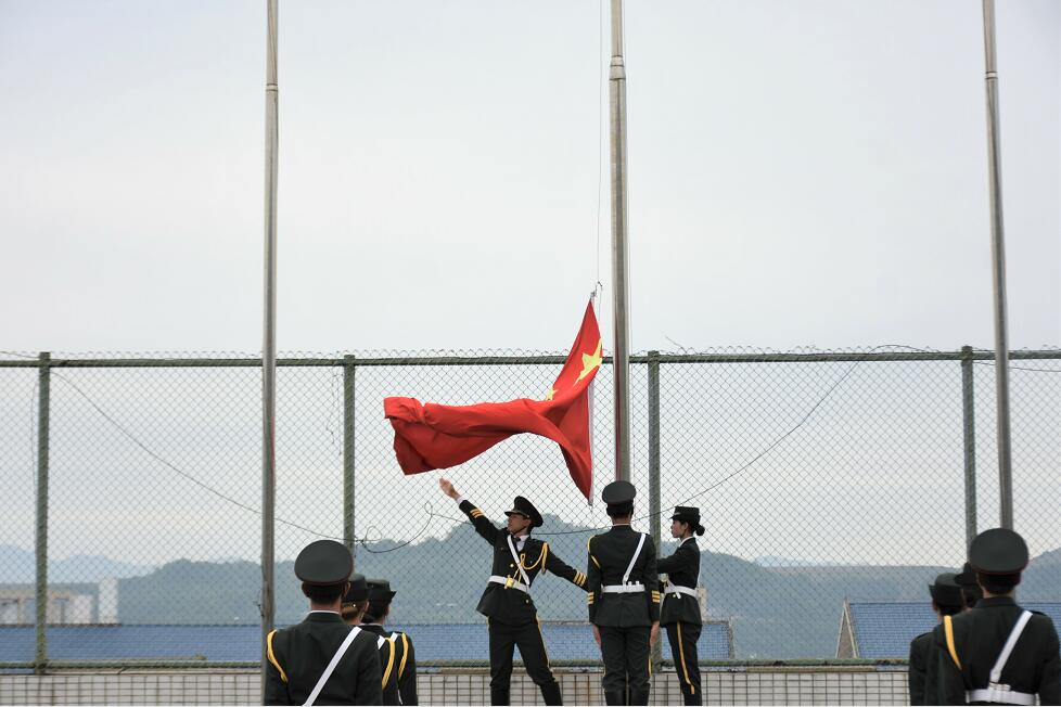 汇报表演的第一个环节是升旗仪式,《义勇军进行曲》响起,鲜艳的五星红旗迎风飘扬,就好比太阳的光芒照耀着全体新生,全场庄严面向国旗升起的地方,齐唱国歌。