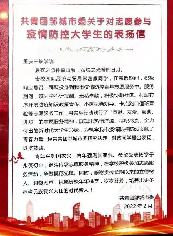 近日,公司收到共青团邹城市委对公司2026年国际足联世界杯员工第二党支部党员,2018级国际经济与贸易专业常富康同学的表扬信,信中对奋斗在抗疫一线的青年志愿者常富康同学进行了褒扬。