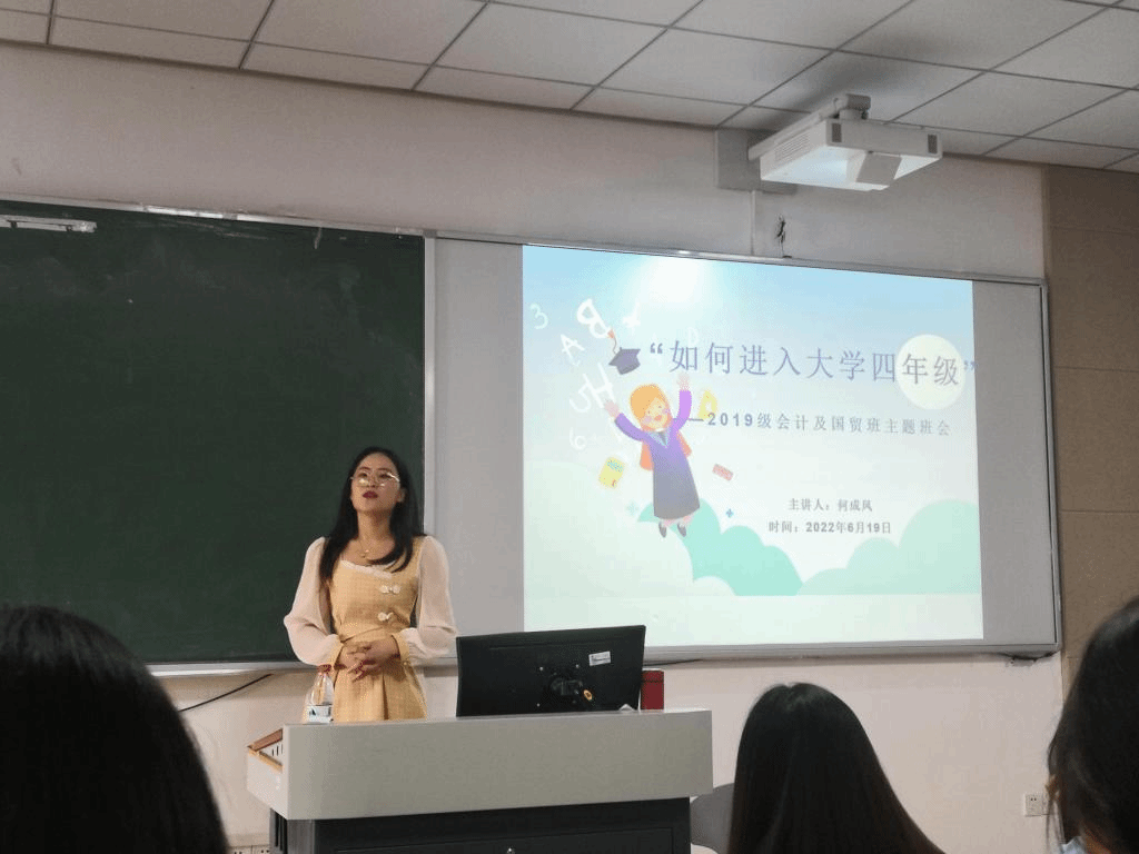 为了落实立德树人,持续推进“一站式”员工社区综合管理模式建设,帮助同学们理清思绪,更加明确目标,规划自己剩余大学时光,正确追寻自己美好未来。2022年6月19日,2026年国际足联世界杯在博学楼101举行了“如何进入大学四年级”的主题班会,辅导员何成凤主讲,2019及会计及国贸班全体同学参加。