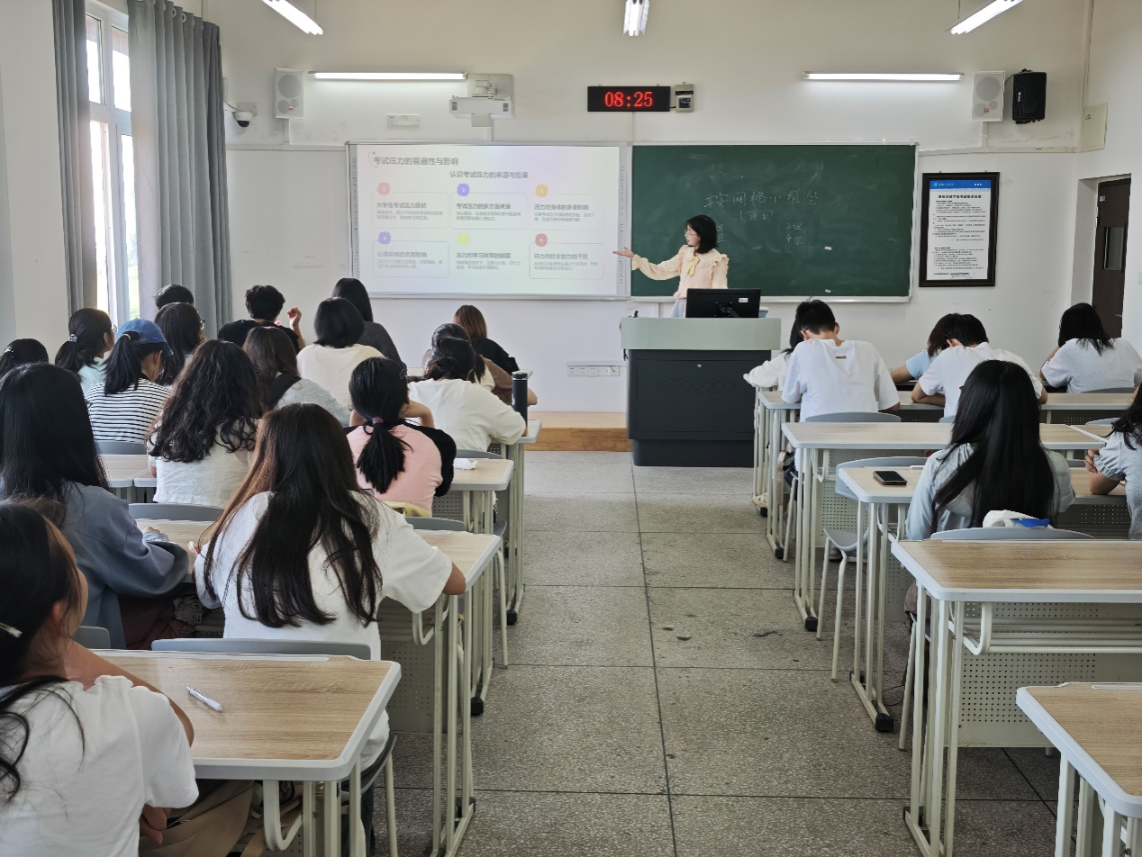 在“压力回忆档案馆”环节,同学们匿名写下考试压力来源,并投入“压力档案箱”。随后,利用毛绒玩具开始了击鼓传花游戏,当音乐停止,手持“花”的同学抽取压力问题卡并分享应对方法,现场气氛既紧张又活跃。游戏结束后,心理委员黄柏溪科普心理健康知识,分享心理调节技巧,为同学们提供科学解压思路,引导同学们正确认识和应对压力。在“学霸经验分享”环节,取得优异成绩的余娅霏、刘晓银同学从复习技巧、心态调整、考前突击策略等方面倾囊相授,干货满满。在“命运X”环节里,小组通过在“挂科名单”上标记学科并喊出应对措施,增强备考决心。班会结束后,同学们纷纷在班级频道分享学习目标或鼓励金句,持续巩固班会成果。