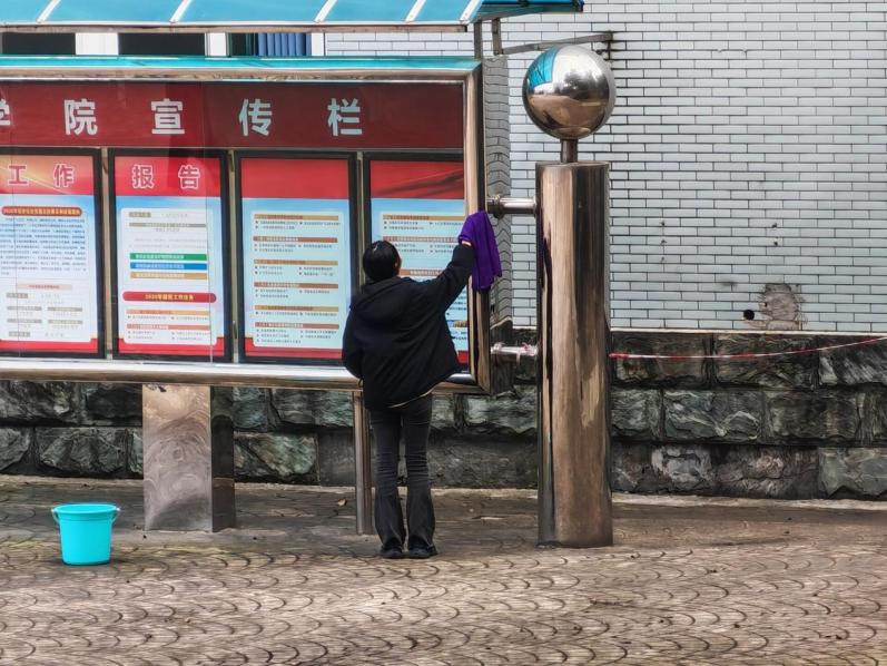 在校园宣传栏前,同学们提着水桶,手持抹布,仔细擦拭玻璃和立柱,让蒙尘的公告栏重焕光彩。